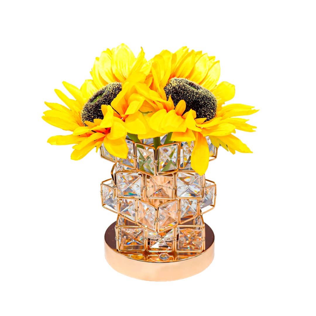 MATERIAL: FLORES ARTIFICIAIS EM ROSA, CRISTAIS DECORATIVOS E BASE DOURADA